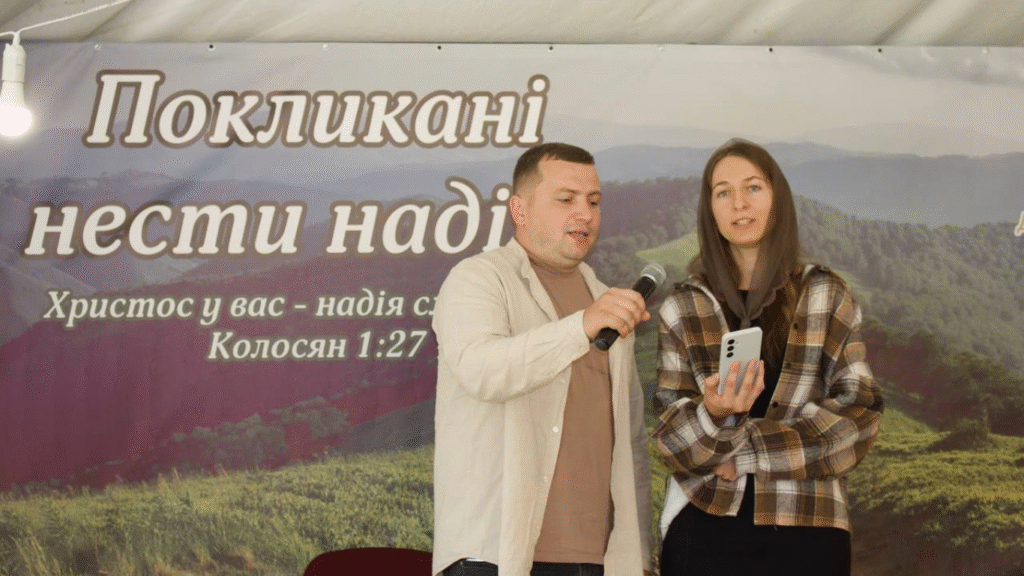Petro was born in the Zhytomyr region, Ilona in the Ternopil region. They belong to the Pentecostal Christian church “Zhyva Nadiya” (Living Hope). Their journey in ministry began even before they met: Ilona served for several months in Skadovsk under occupation and later returned to a mission in the Lviv region, where she met Petro. After their wedding, they embarked on their first mission together.